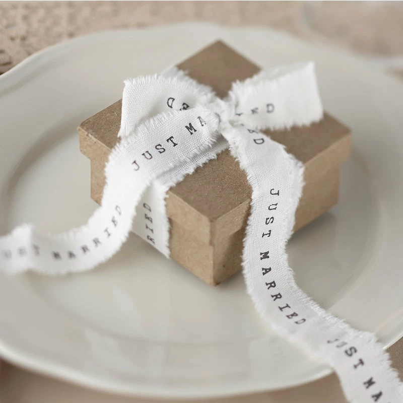 White frayed ribbon with the words Just Married printed with a vintage typewriter font, ideal for wrapping favours or gifts.