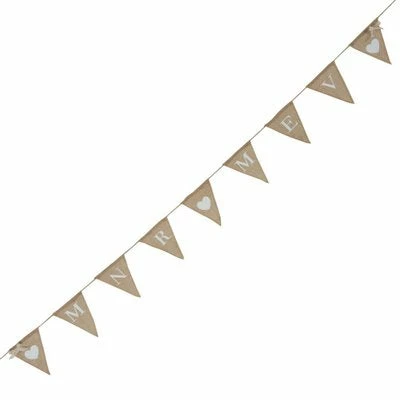 Ons rustieke Hessian-vintage-bunting het die woorde “Mnr” en “Mev” in driehoekige vlae in wit gedruk. Ideaal vir die trou ontvangs of buite die kerk.