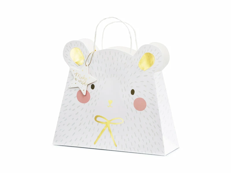 Gift bag Polar bear in white colour with colorful and gold metallic print, size without handles approx. 31.5 x 27 x 10 cm.