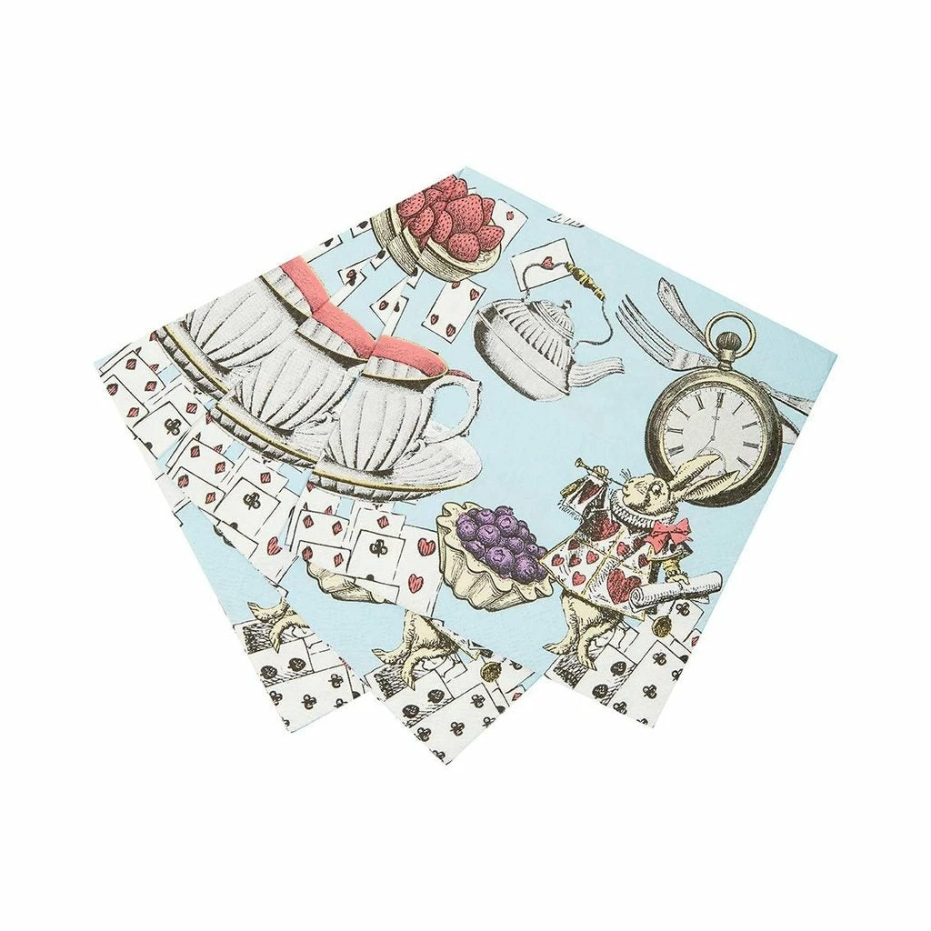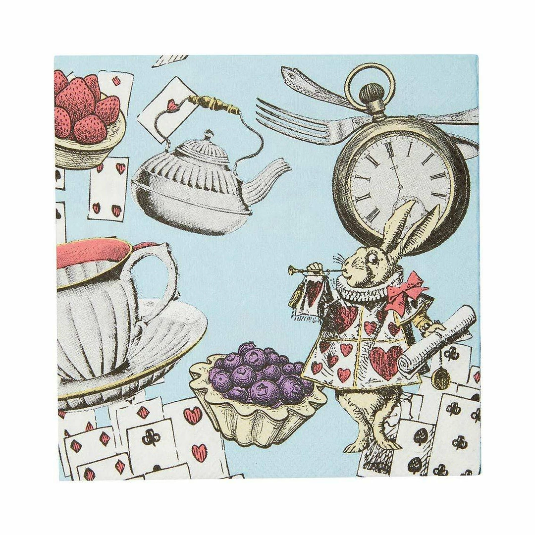 Blue illustrated Alice in Wonderland Cocktail Napkins. This pack of 20 small paper napkins are perfect for a Mad Hatter Tea Party, birthday, picnic or garden party!