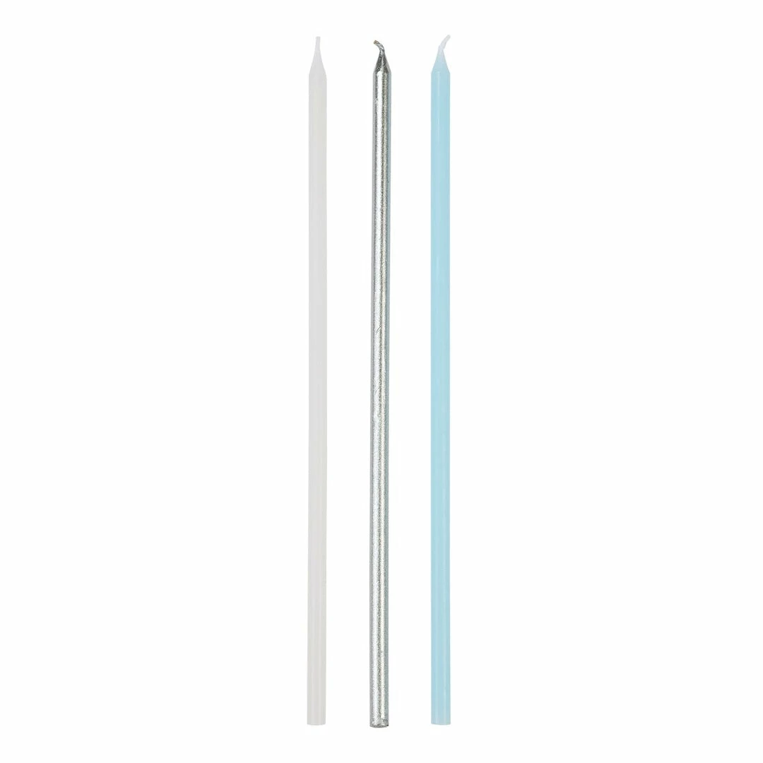 These long blue, white and metallic silver candles are perfect for adding height to a special birthday cake this year.