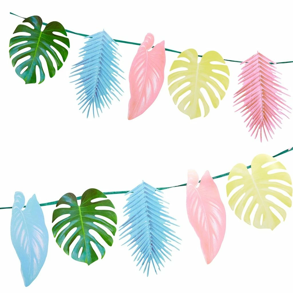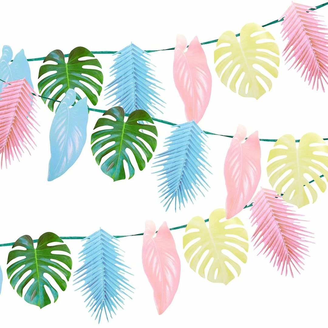 Pastel Tropical Palm Leaf Paper Garland. This party decoration features 12 palm leaves in pretty pastel colours. This garland is double-sided, simply hang on the wall, in the garden or across the ceiling to create a tropical atmosphere that your guests will love! Perfect for a tropical themed birthday party, fiesta or summer garden party.