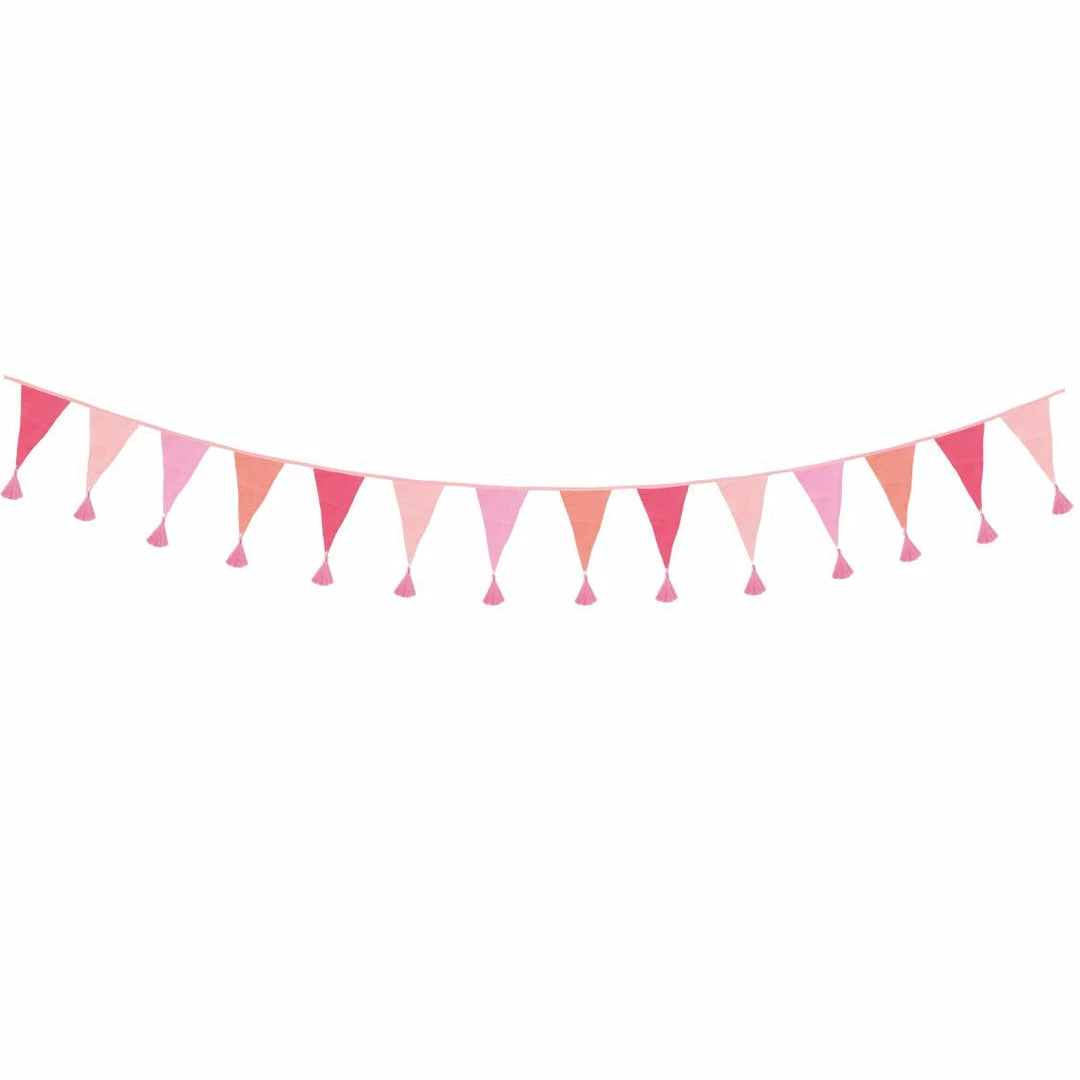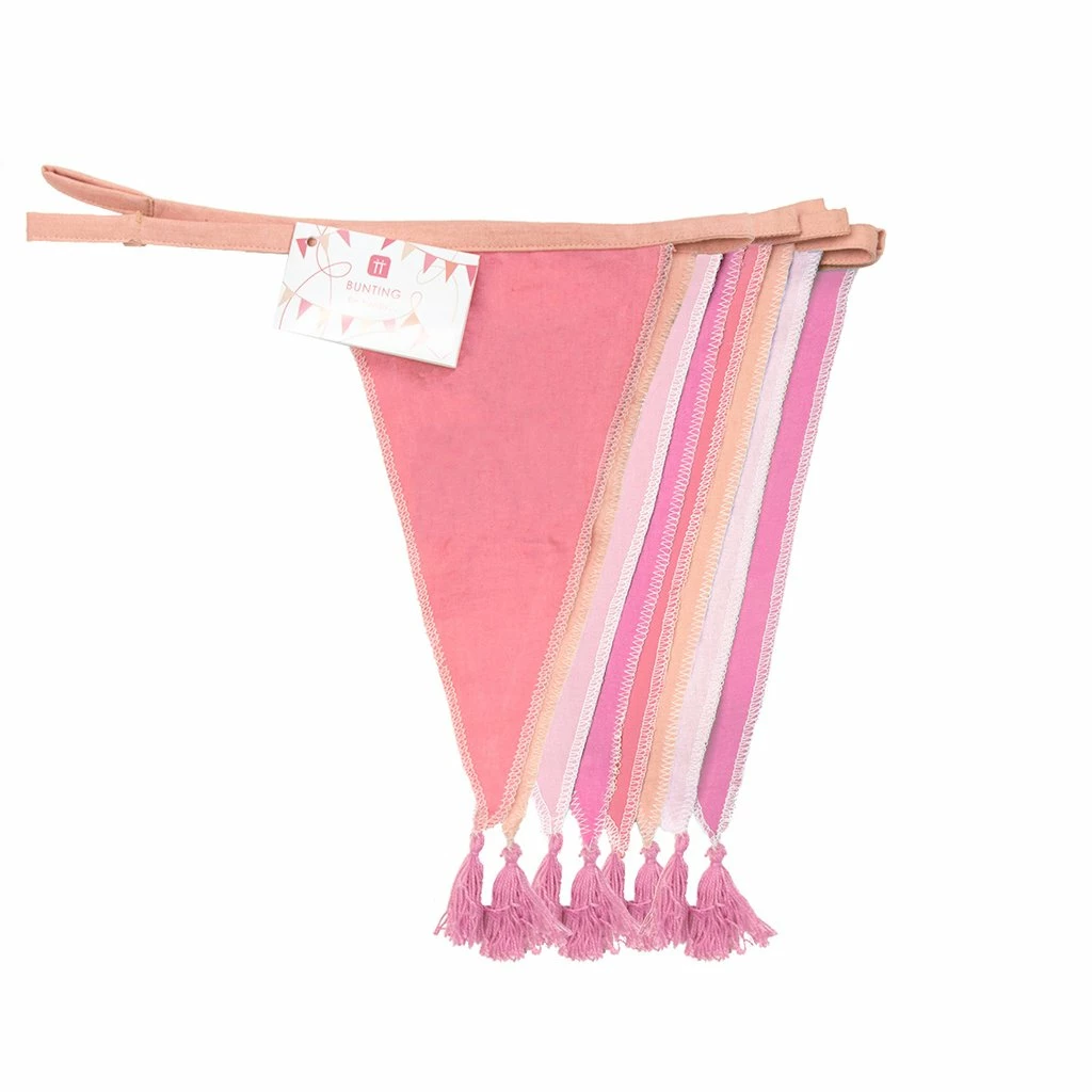 Pink Fabric Bunting with Tassels. This reusable bunting is handmade from sustainably sourced 100% cotton and is washable. Suitable for indoor and outdoor use and perfect for adding a pop of colour to any special occasion, girl’s birthday party, garden party, baby shower or BBQ! It also makes for lovely home décor in a child’s bedroom or lounge. Each pennant is double-sided, simply hang on the wall, in the garden or across the ceiling to create a fun atmosphere your guests will love!
